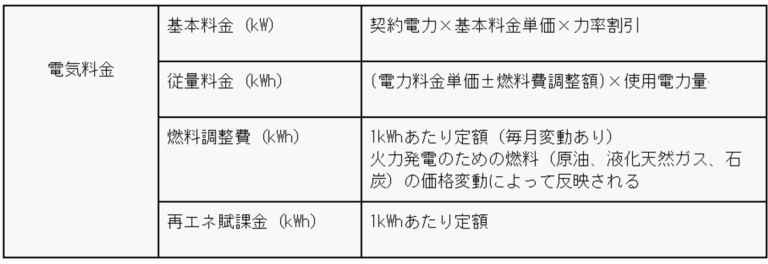電気料金は「基本料金」「従量料金」「燃料調整費」「再エネ賦課金」の大きく4つで構成されています。