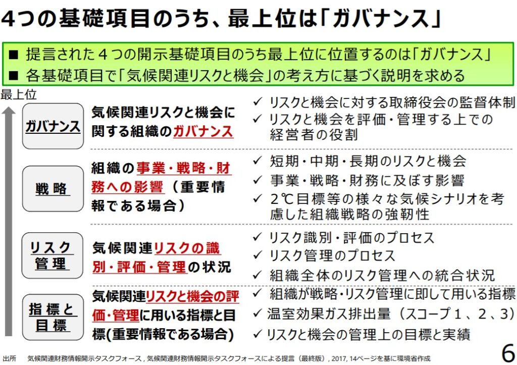これは2017年に発表された国際的な情報開示の枠組みで、以下の4項目に基づいて報告を求めています。