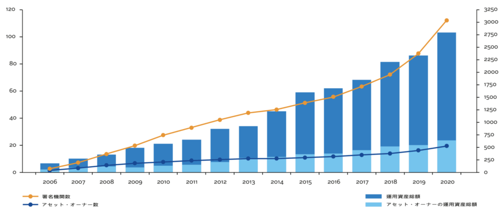 署名機関数や運用資産は年々増加しており、世界中でESG投資が広がっています。