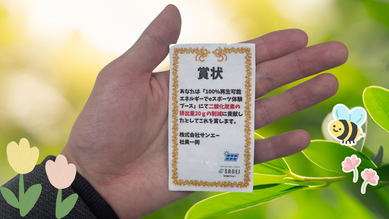 この再エネ100%eスポーツ体験では、ゲームを1プレイするごとに、約20gのCO₂削減に貢献しているとされています。