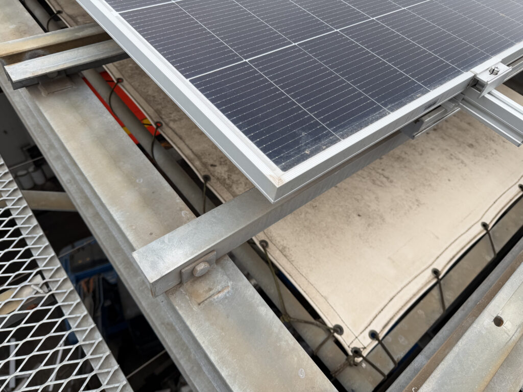 開閉式屋根上に架台が組まれ、太陽光パネルが設置されている。
