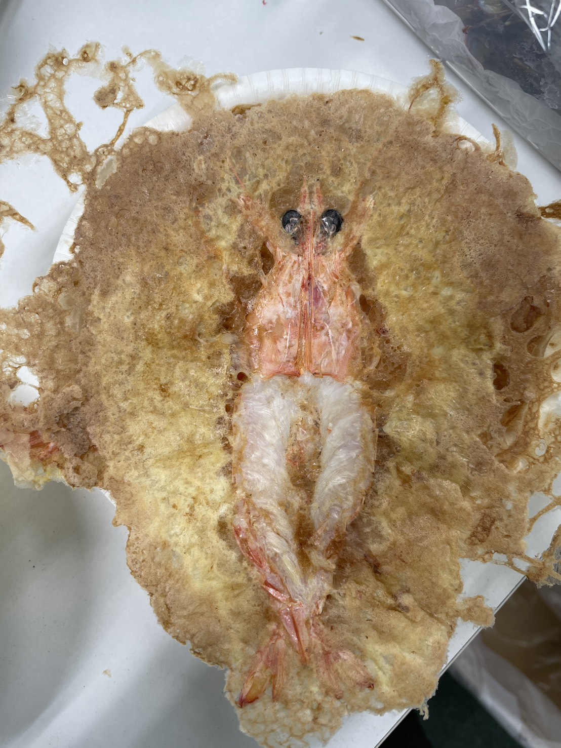 今回の目玉のひとつが、車海老を使った「えびせんべい」づくりです。最初は焼き加減や水分量が安定せず、形が崩れてしまうこともありました。