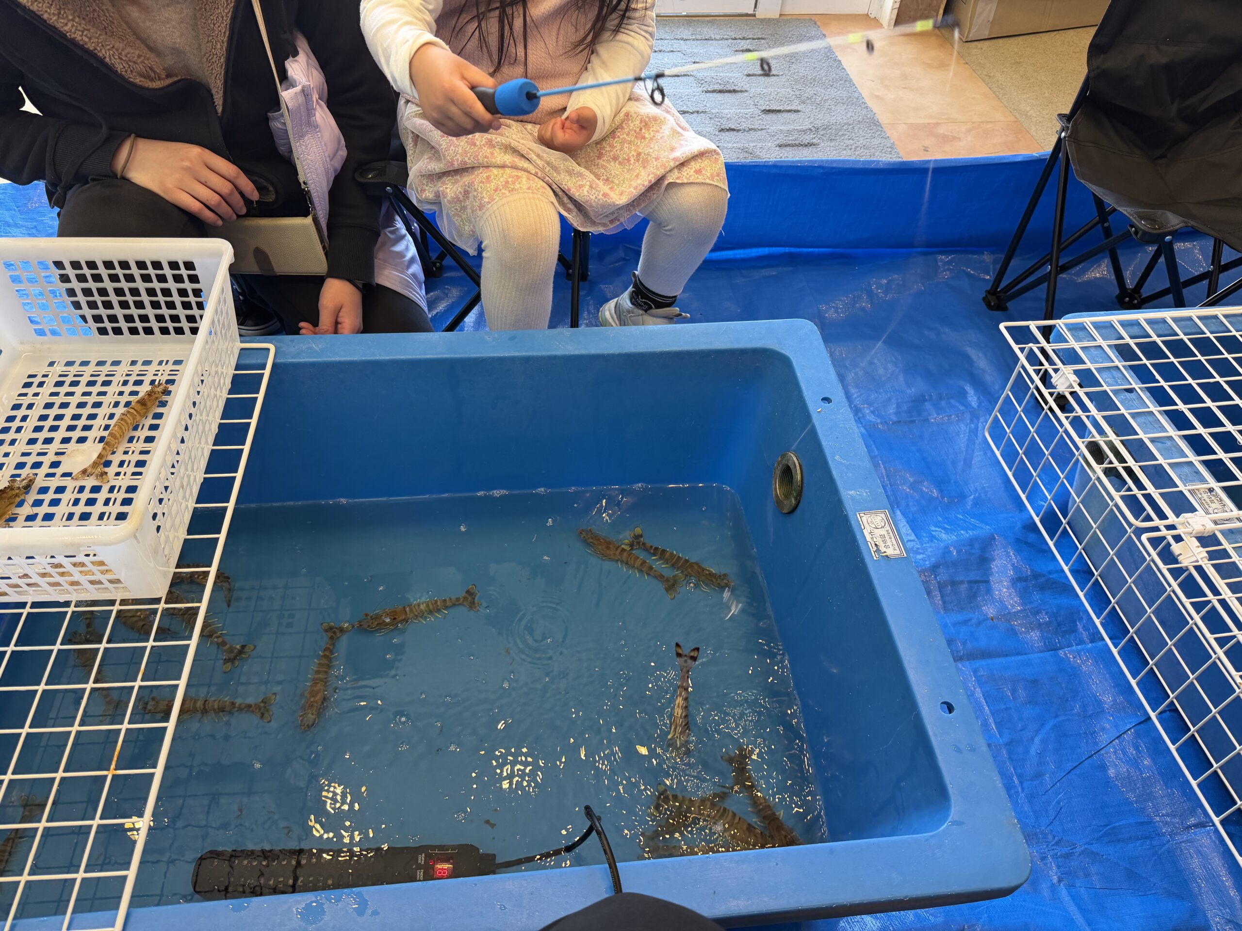 もう一つの人気コンテンツが「海老釣り」です。水槽をのぞき込みながら狙いを定め、糸を垂らすと、子どもたちの表情は一気に真剣モードに。